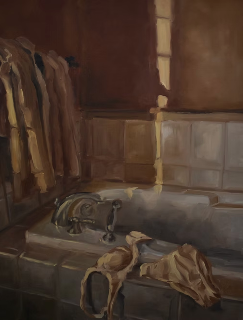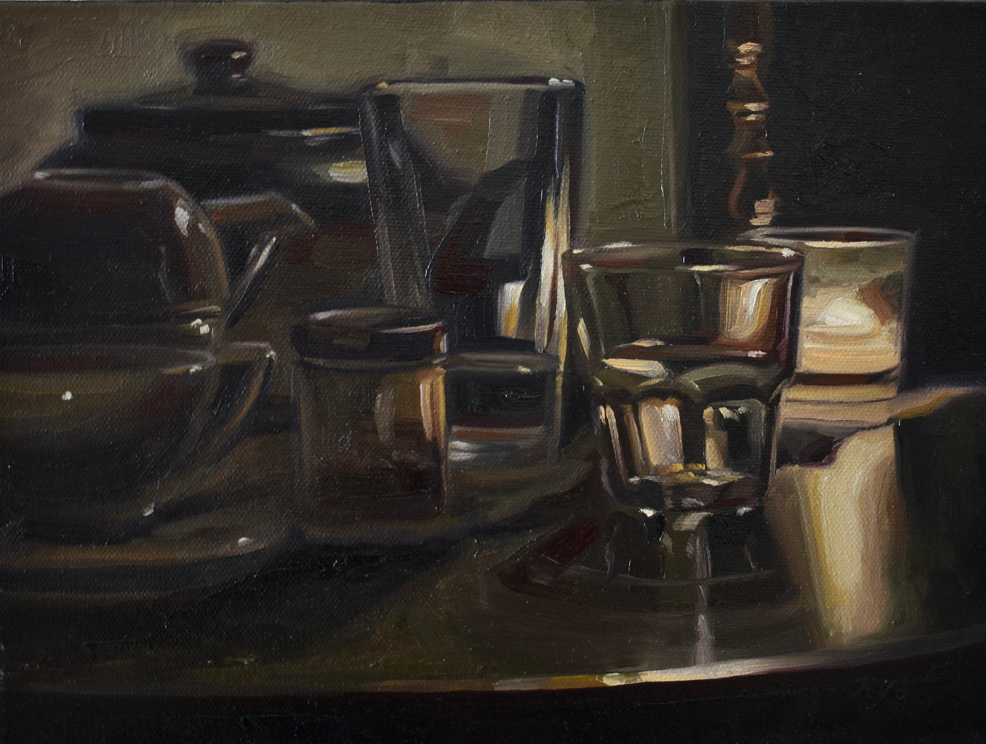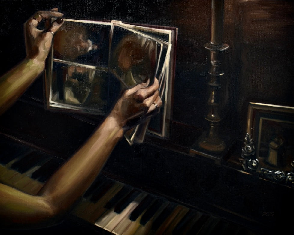 This painting reflects on grief and loss, and how we are changed as a result of it. We may see ourselves in the mirror, but cast shadows reflect a vulnerable silhouette.